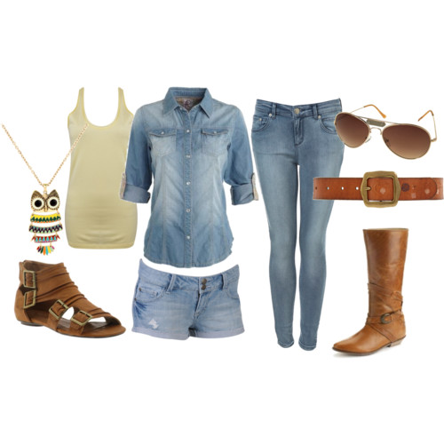 Product Information: Blue Denim Long Sleeve Shirt from debenhams.com, $42; Fresh Racerback Tank from Forever 21, $5.80; Bleach Knitted Jeggings from Topshop, $70; Jordin Denim Short from Forever 21, $16; Tan Almond Toe Boots from debenhams.com, $68; Wanted Crete sandals from piperlime.gap.com, $50; Owl Long Pendant from asos.com, $14; Leather Trim Aviators from Topshop, $30; Lucky Brand belt from zappos.com, $50