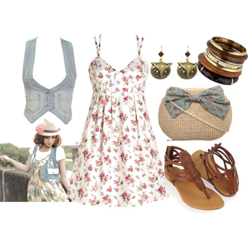 Product Information: Denim Vest from westfield.com, $27; Livia Floral Dress from Delia’s, $45; Owl Head Drop Earrings from tarinatarantino.com, $35; Jungle Bangle Stack from oasis-stores.com, $21; Cream Floral X Body Straw Bag from missselfridge.com, $23; Sandals from Forever 21, $16