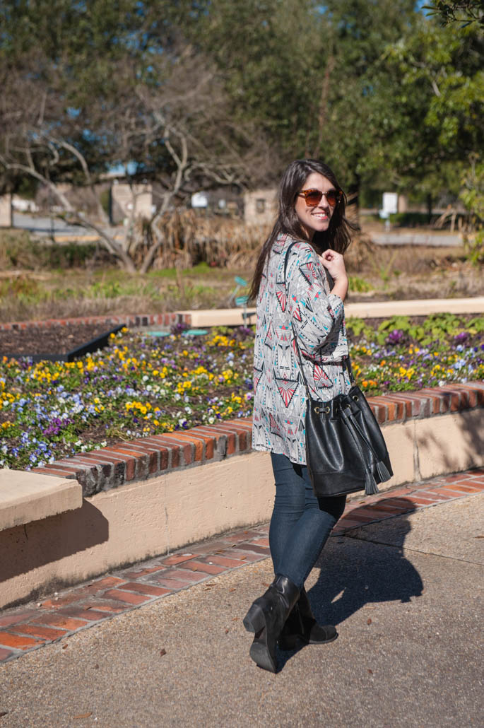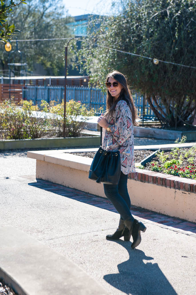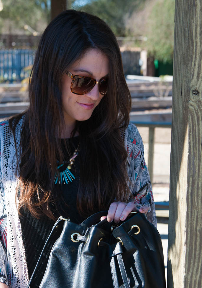 If you saw Monday’s post, then you know I’m all about adding some springtime color into my winter wardrobe. That’s exactly why I was drawn to this printed lace trim kimono from Target the other day- must be the part of me that’s itchin’ for spring with these 70 degree temps! I liked its turquoise and coral patterns (it comes in navy, cream, and coral too!) and I knew it would be perfect to layer over darker winter items as an easy way to brighten them up a bit.