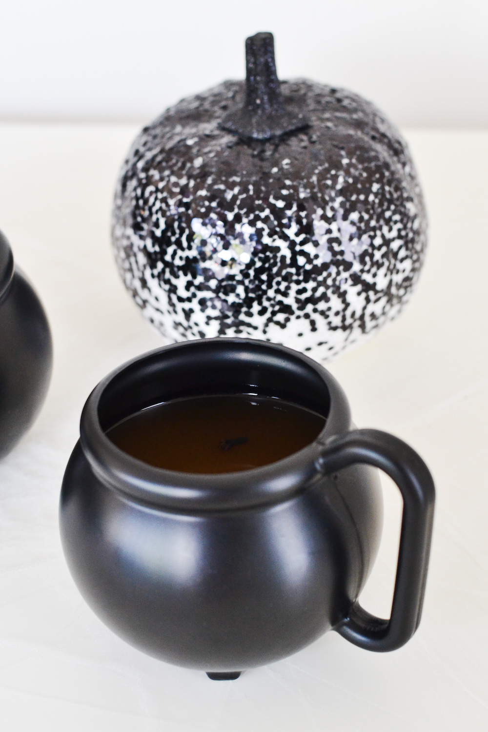 I make Spiked Mulled Apple Cider all fall and winter long. It’s really easy to make a big batch, so we serve it at holiday parties. I thought it’d be perfect for a Halloween party served in these cute cauldron mugs. You can make this in the crockpot or on the stove. I like this easy version from The Food Network:
