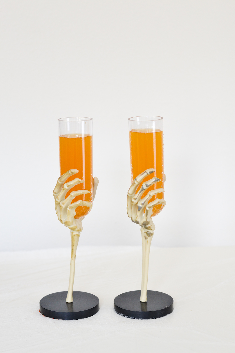 These apple cider mimosas would be so fun for Halloween weekend served in these skeleton hand flutes. This recipe takes just seconds to make!