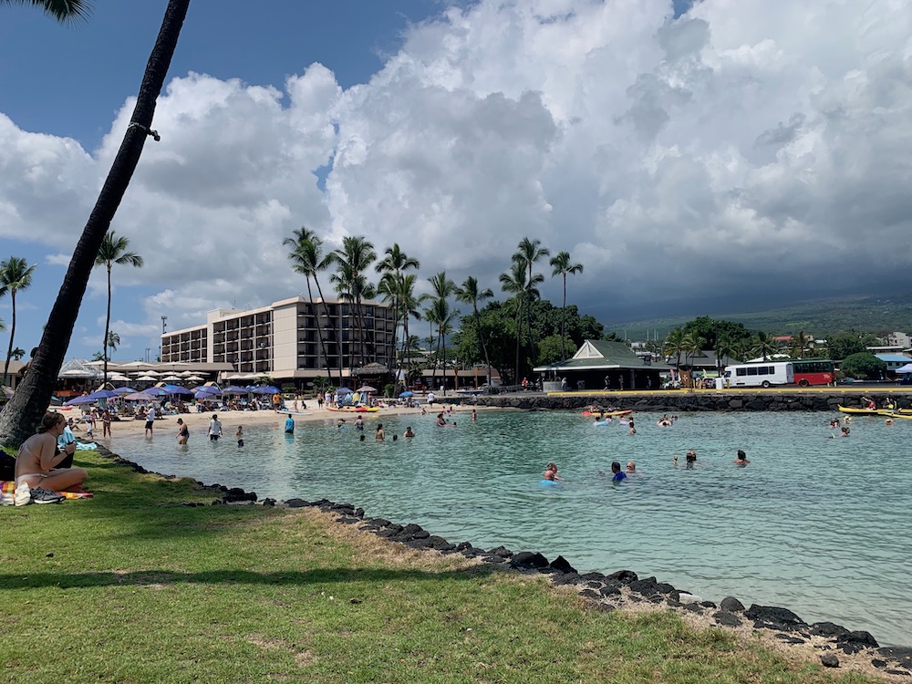 I loved how charming Kona was — it had more of a vintage 70s vibe that made me feel like I had stepped back in time. We tendered in from the cruise ship right next to Kamakahonu Beach. This is a small beach known for its snorkeling, and it’s right in the heart of Kona with tons of shops and restaurants around.