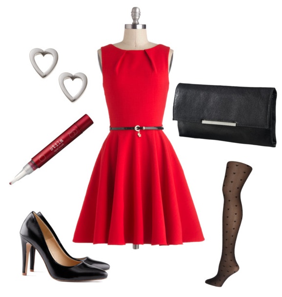 Product Information: Luck Be A Lady dress from Modcloth, $75; Heart tights from Dorothy Perkins, $12; Black heels from H&M, $47; Mossimo clutch from Target, $6; Heart-shaped studs from Oliver Bonas, $16